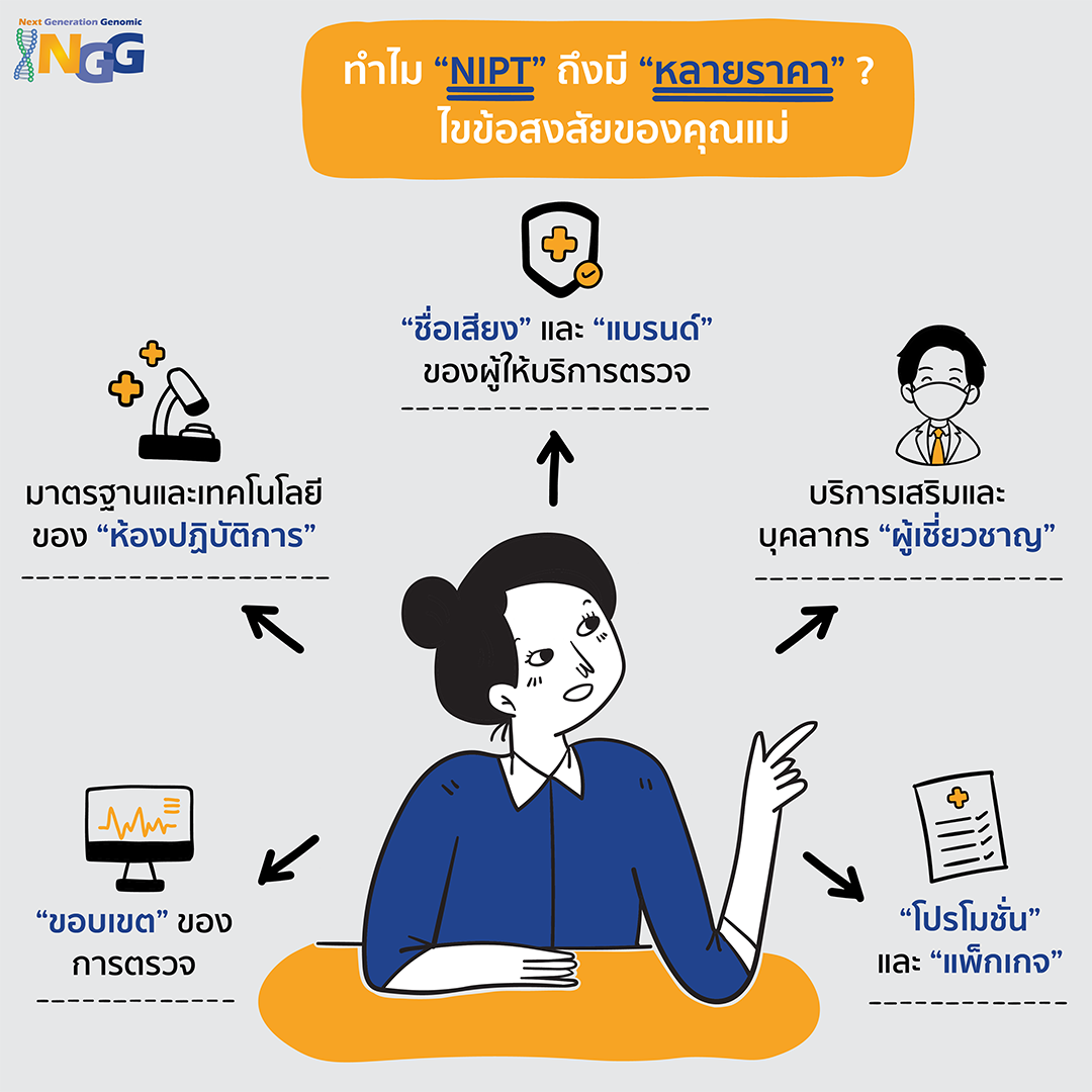 • มีหลายแบรนด์ของ NIPT ทั้งจากต่างประเทศและในประเทศ แต่ละแบรนด์อาจมีราคาที่แตกต่างกันไปตามมาตรฐาน การวิจัยและพัฒนา รวมถึงความน่าเชื่อถือที่สะสมมา